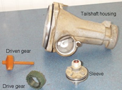 tailshaft housing at top, the sleeve at bottom right, drive gear at bottom left, and the
